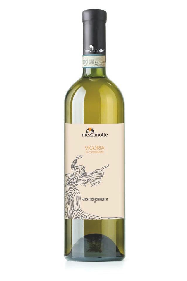 Ottenuto da uve Incrocio Bruni 54, caratteristico vitigno marchigiano concepito negli anni ’30 del secolo scorso per impollinazione tra viti di Verdicchio e di Sauvignon Blanc dall’ampelografo senigalliese Bruno Bruni. Dall’incontro di questi due grandi vitigni si ha un vino dal profilo aromatico fine e dalla buona struttura. Il retrogusto è delicatamente e piacevolmente amaro. Grazie a Cantina Mezzanotte l’Incrocio Bruni 54 è stato riscoperto e sta avendo una meritata valorizzazione.