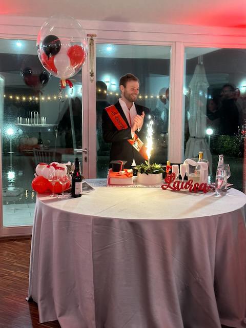 Per l’occasione, l’ampia sala della villa è stata impreziosita da un raffinato tocco di rosso, colore simbolo della tradizione accademica italiana. Dettagli curati, mise en place coordinate e un’illuminazione calda hanno valorizzato gli spazi, creando un ambiente solenne ma al tempo stesso accogliente.